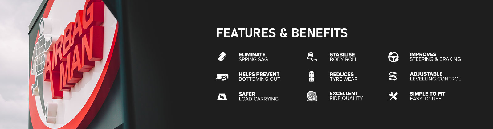 EASY LEVELLING CONTROL Airbag Man Design & Manufacture vehicle specific Air Suspension Solutions to suit a wide range of Light to Heavy Automotive Applications for Maintaining a Safe & Level Ride Height when towing or carrying load.